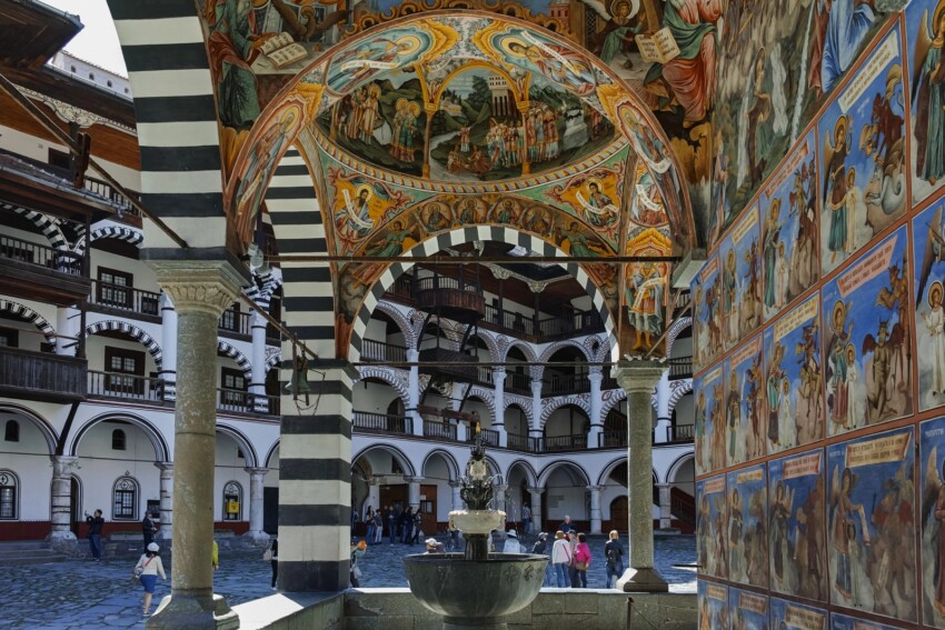 L’impatto visivo del Monastero di Rila inizia ancora prima di varcare l’ingresso principale: il portico esterno, lungo tutto il perimetro del piano terra, è interamente coperto da affreschi che si estendono su oltre 1.200 metri quadrati di superficie. Le scene raffigurate spaziano dalla vita di Ivan Rilski ai temi apocalittici del Giudizio Universale, dai miracoli dei santi ortodossi alle allegorie dei vizi e delle virtù. Lo stile è quello del Rinascimento Bulgaro tardo, con figure allungate, colori vividi e un utilizzo dell’oro che cattura la luce in modo diverso a ogni ora del giorno.